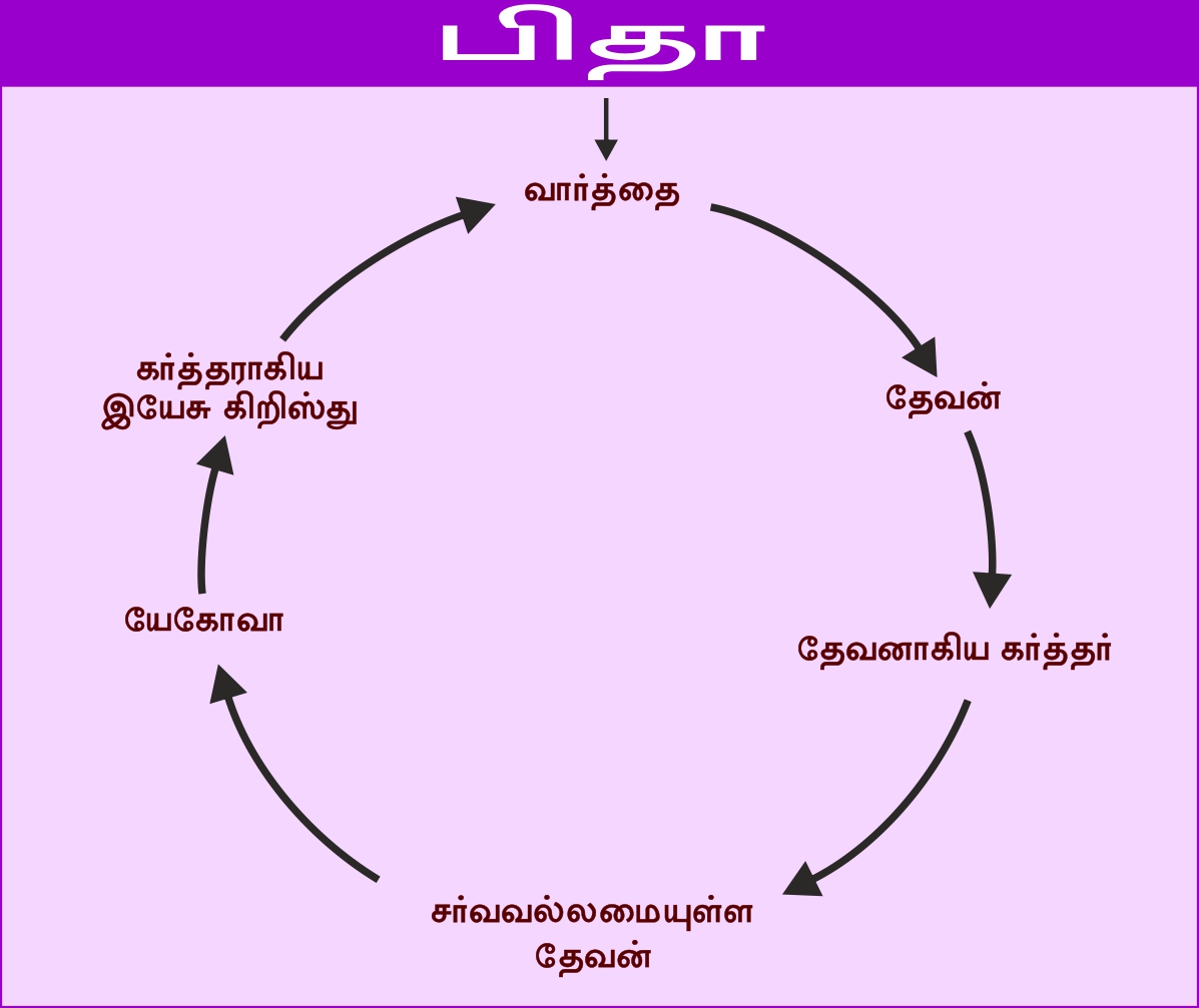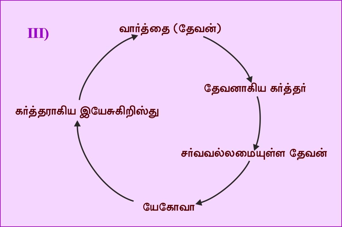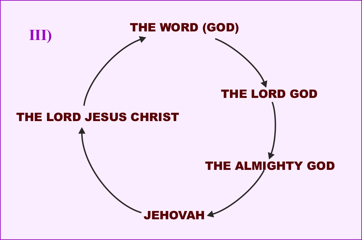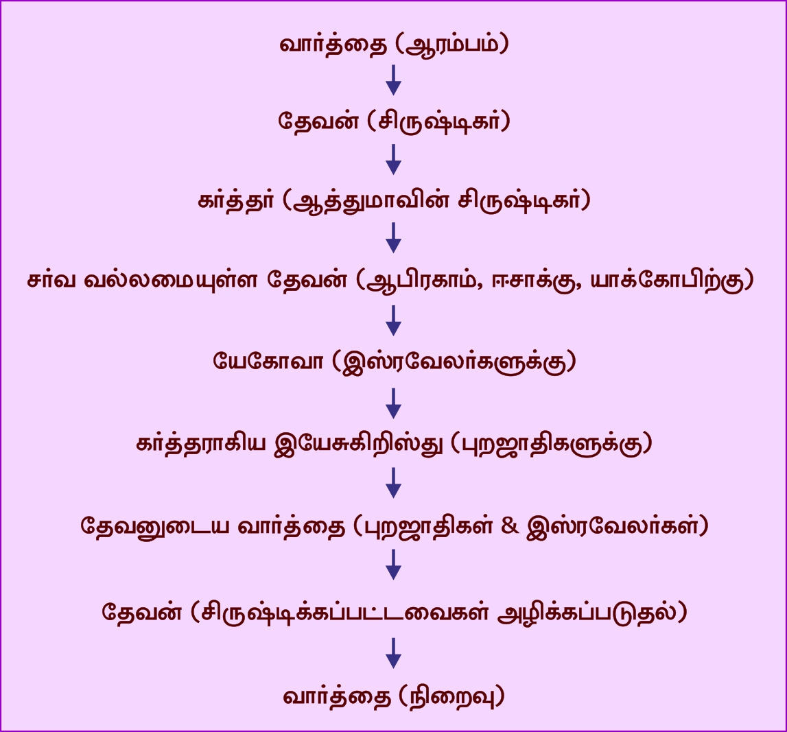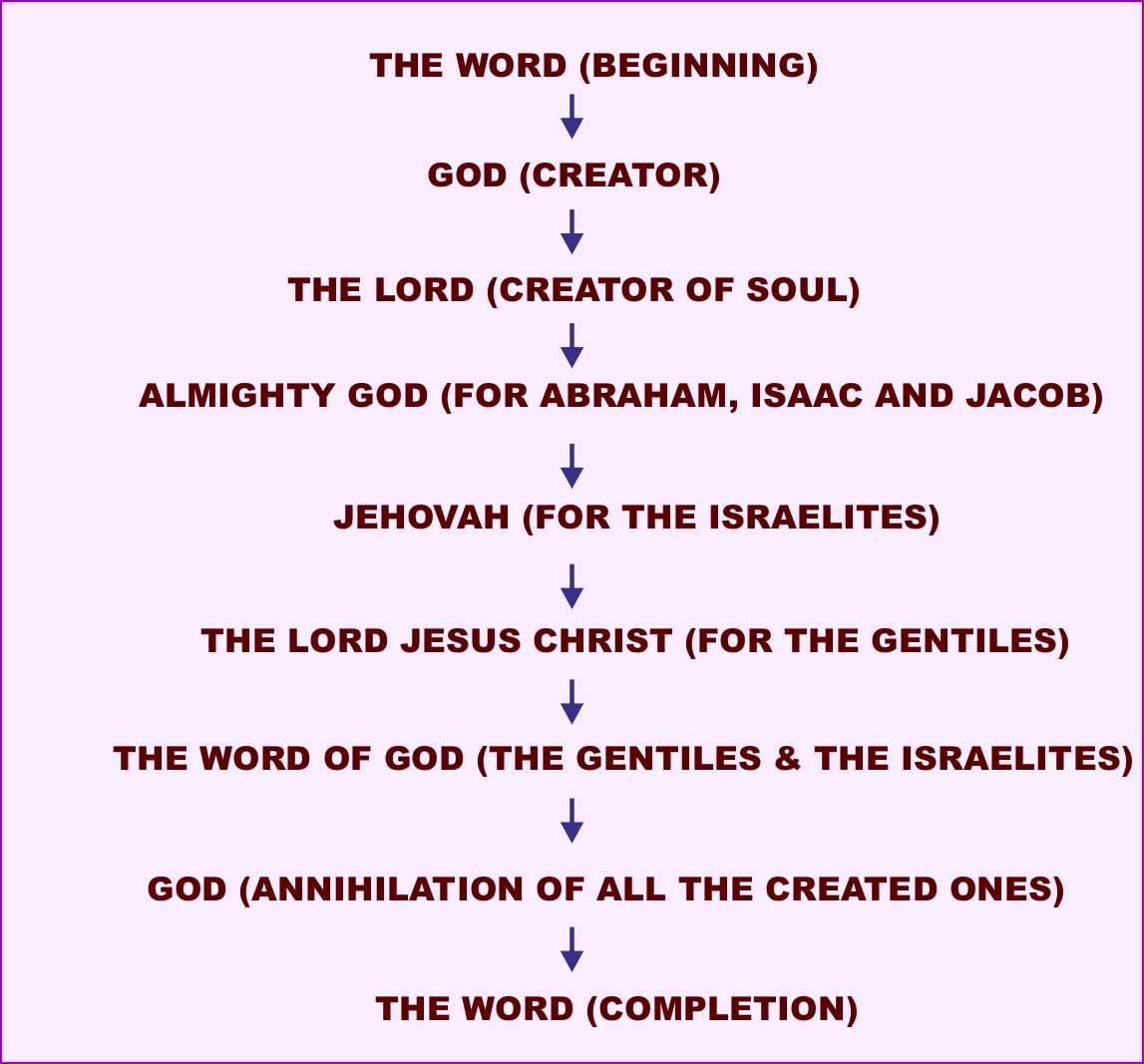 பிதாவிடமிருந்து அனுப்பப்பட்ட வார்த்தை, தேவன் என்ற நாமத்தில் கிரியையினை ஆரம்பித்து, வார்த்தை என்ற நாமத்தில் கிரியைகளை நிறைவேற்றி, பிதாவிடம் சென்றடைகின்றது.