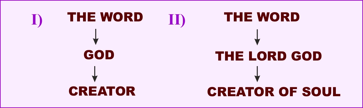 ஆதியிலே வார்த்தை இருந்தது, அந்த வார்த்தை தேவனாயிருந்தது. சிருஷ்டித்தபோது அவர் தேவனாக இருந்தார். ஆத்துமா என்ற உள்ளான மனிதனை உருவாக்கியபோது அவர் கர்த்தராகக் கிரியை செய்தார். ஆத்துமா கர்த்தத்துவத்தின் கிரியையாகும்.
