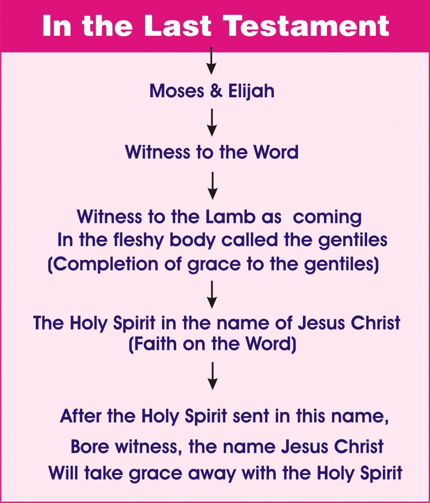 In the time of the Last Testament, the Word, the Son must be glorified. After the tribulation, the Word will be glorified. The bride will be taken up before this tribulation. And after that, grace will return to the Israelites. After His name “The WORD” is glorified, the Israelites will receive the Holy Spirit in the name, “The Word of God”. After that the Holy Spirit will not be commanded in the name 'Jesus Christ'. Just as the name 'Jehovah' was not commanded to the Holy Spirit after Jesus Christ was glorified, so also after the Word is glorified, the Holy Spirit will not be commanded in the name of Jesus Christ. Just as the Holy Spirit commanded in the Jehovah was taken, so also the Holy Spirit commanded in the name of Jesus Christ will be taken. But the name Jesus Christ will endure in this earth till the end. The Christians who worship Jesus Christ as God will endure to the end of this world. But the Holy Spirit which is sent to bear witness to Jesus Christ will not work in the name 'the Lord Jesus Christ'.
