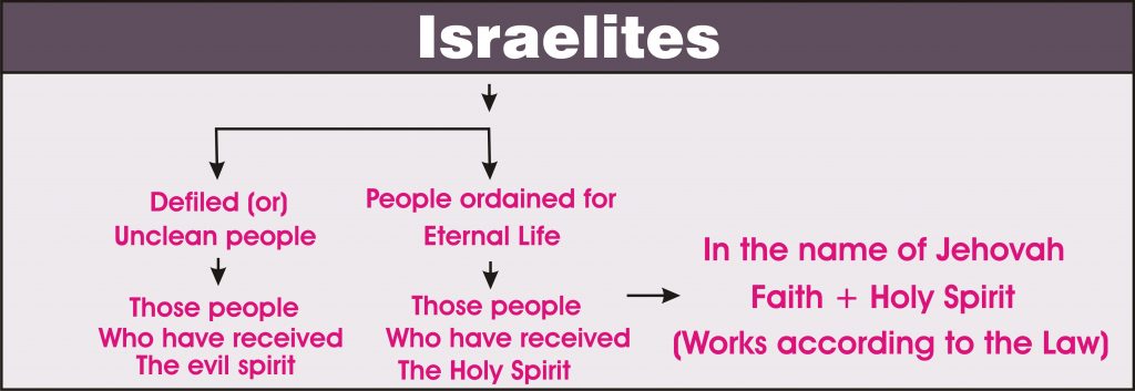 The people, who were the believers of JEHOVAH and followed the Law, received the Holy Spirit. Those people who had not received the Holy Spirit were all unclean people. The unclean soul is condemned for punishment. Among the Israelites, those people who had received the Holy Spirit were the saints. Although the Israelites had the Lord as their God, unclean people were ordained for condemnation, and the people who had received the Holy Spirit, were ordained for eternal life.