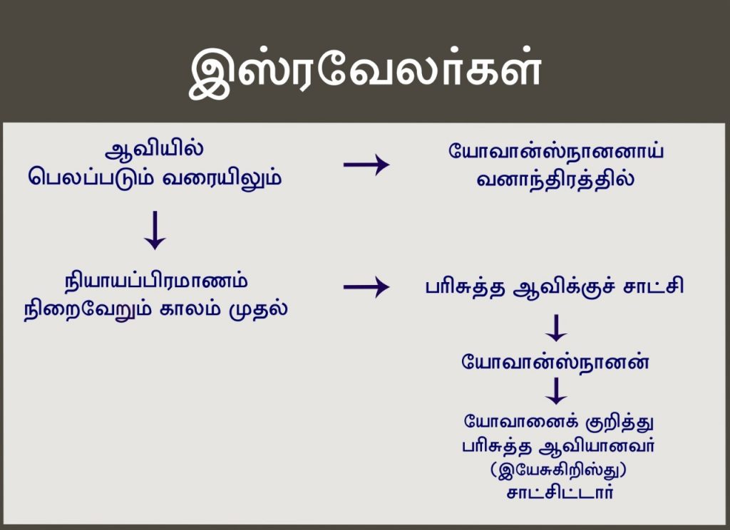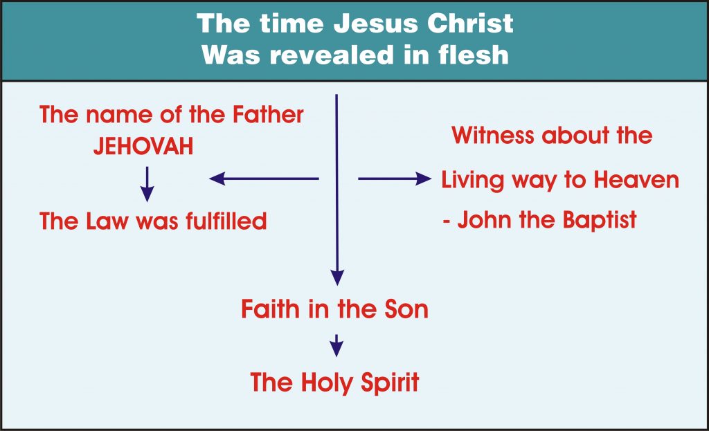 யேகோவா என்ற நாமத்தின் மூலமாகவும், நியாயப்பிரமாணத்தின் கிரியையின் மூலமாகவும் அனுப்பப்பட்ட பரிசுத்த ஆவி எப்போது நிறுத்தப்பட வேண்டும் என்று கர்த்தரால் திட்டம்பண்ணப்பட்டிருந்ததோ, அதுவரையிலும் அவன் வெட்டுக்கிளியையும், காட்டுத்தேனையும் சாப்பிட்டு வனாந்திரங்களில் சுற்றிக்கொண்டு இருந்தான். கிருபையின் மதகுகள் இஸ்ரவேலருக்கு எப்போது அடைக்கப்பட்டதோ, அப்போதே நியாயப்பிரமாணத்தின் கிரியைகள் என்ற பிரமாணம் நிறைவேறி, விசுவாசம் என்ற கிரியை வந்தது. கிறிஸ்துவை விசுவாசிக்க வேண்டும் என்பதற்காகவே யோவான்ஸ்நானன் சாட்சியிட அனுப்பப்பட்டான்.