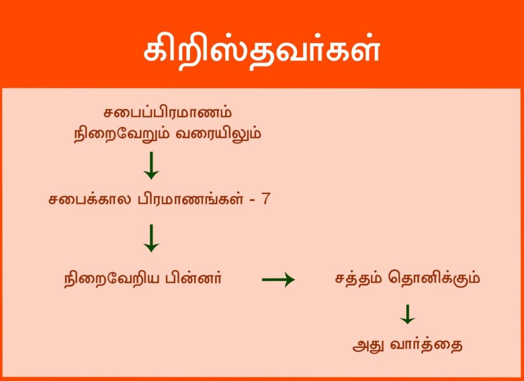 இஸ்ரவேலர்களிடம் நிகழ்ந்த நிகழ்வு போல கிறிஸ்தவர்களிடமும் நிகழ வேண்டும். சபைப் பிரமாணம் நிறைவேற வேண்டும். அது பாவநிவாரண பலியாகச் செலுத்தப்பட தகுதி இல்லாத நிலைக்கு வரவேண்டும். அப்படி தகுதி இல்லாமல் போகும்வரையிலும், ஸ்நானமும், சபைப்பிரமாணமும் நீதியான கிரியைகளாக இருக்கும். சபைப்பிரமாணம் நிறைவேறும் வரையிலும் வார்த்தையின் சத்தம் பாபிலோனுக்கு எதிராகத் தொனிக்காது. சபைப்பிரமாணம் நிறைவடைந்த பின்னர், வார்த்தையின் சத்தம் தொனிக்கப்பட வேண்டும். அந்த சத்தம் ஜீவனுக்குச் சாட்சி. அந்த சத்தம் தொனிக்க ஆரம்பித்தவுடன், சபைப்பிரமாணங்கள் நிறைவேறிவிடும். அதன்பின்னர் ஏழு சபைப்பிரமாணங்களைக் கொண்டு செயல்படும் சபைகளில் ஏறெடுக்கப்படும் பலிகளைக் கர்த்தர் அங்கீகரிப்பதில்லை.