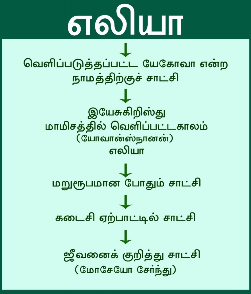 பழைய ஏற்பாட்டில் எலியா கொடுத்த சாட்சி யேகோவா என்னும் நாமத்தினைக் குறித்த சாட்சியாகும். கர்த்தர் தெய்வமானால், கர்த்தரைப் பின்பற்றுங்கள். நீங்கள் எந்தமட்டும் குந்திகுந்தி நடப்பீர்கள். யேகோவா தெய்வமானால், யேகோவாவைப் பின்பற்றுங்கள் என்று வெளிப்படுத்தப்பட்ட நாமத்திற்குச் சாட்சி கொடுத்தார். அடுத்தபடியாக, இயேசுகிறிஸ்து மாமிசத்தில் வெளிப்பட்டபோது, இயேசுகிறிஸ்து என்ற நாமத்திற்குச் சாட்சியிட்டார். யேகோவா என்ற நாமத்திற்குச் சாட்சியிட்டது மோசே. இயேசுகிறிஸ்து என்ற நாமத்திற்குச் சாட்சியிட்டது எலியா (யோவான்ஸ்நானனாக). இயேசுகிறிஸ்துவோடு மறுரூபமாகி இருவரும் சாட்சியிட்டுள்ளார்கள். மேலும் அவர்கள் இருவரும் கடைசி ஏற்பாட்டில் அவருடைய நாமத்தைக் குறித்துச் சாட்சியிடுவார்கள்.