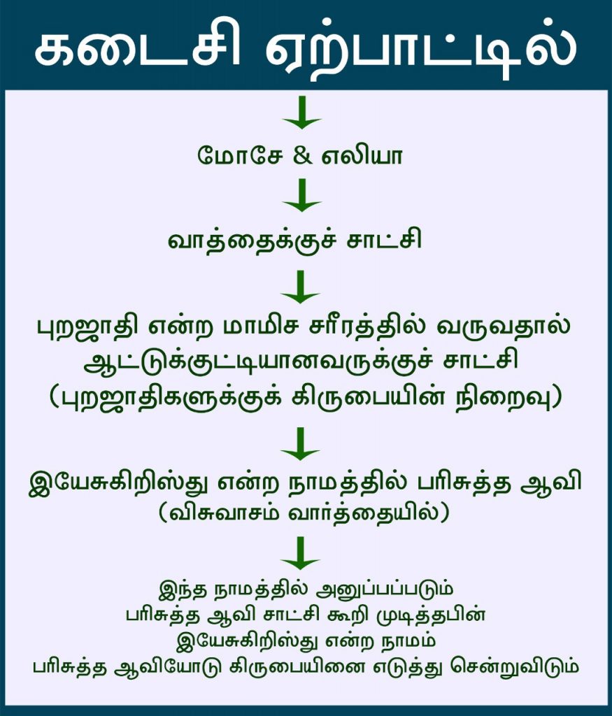 கடைசி ஏற்பாட்டின் இரண்டு சாட்சிகளும் வார்த்தைக்காக இரத்த சாட்சிகளாக மரிக்க வேண்டும். அவர்களோடு இருந்தவர்களும் சாட்சியினைப் பின்பற்றுவதினால், மாமிச மரணத்திற்குள்ளாக்கப்படுவார்கள். அந்த இரண்டு சாட்சிகளின் வார்த்தையினை ஏற்றுக்கொள்பவர்கள் இயேசுகிறிஸ்து என்னும் நாமத்தில் பரிசுத்த ஆவியினைப் பெற்றுக்கொள்வார்கள். அத்தோடு இயேசுகிறிஸ்து என்ற நாமத்தில் அனுப்பப்படும் பரிசுத்த ஆவியானவரின் கிரியைகள் இந்தப் பூமியில் நிறைவுபெறும்.