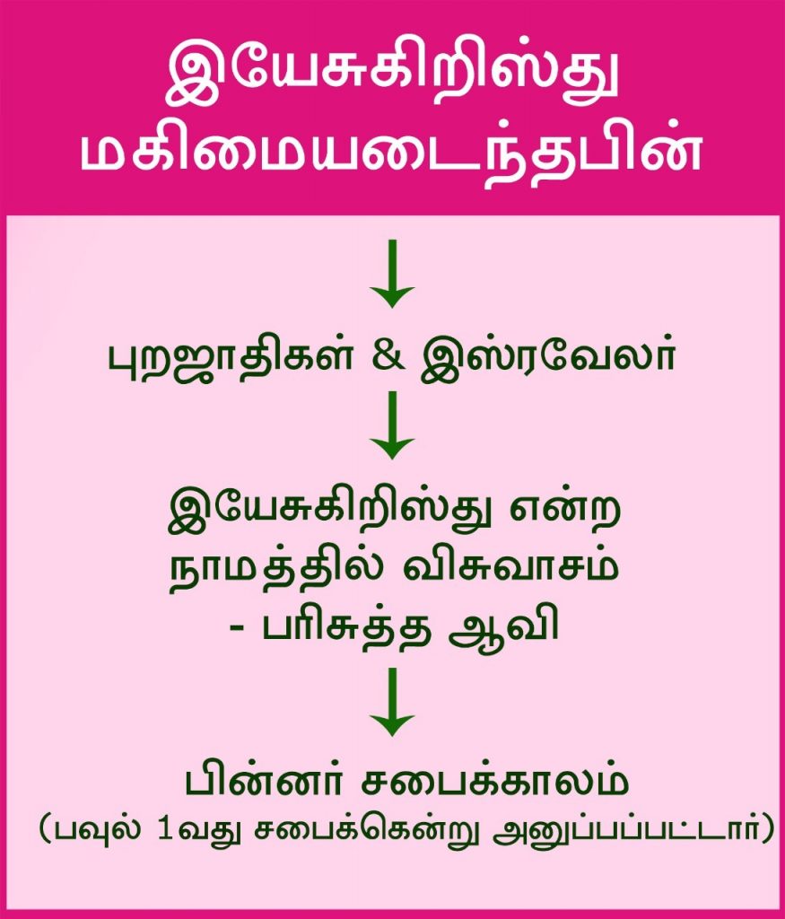 முதன்முதலில் இயேசுகிறிஸ்து என்ற நாமத்தில் பரிசுத்த ஆவியானது கொர்நேலியுவின் வீட்டில் இருந்த புறஜாதிகளிடம் அனுப்பப்பட்டது. இயேசுகிறிஸ்துவின் நாமத்தில் அனுப்பப்பட்ட பரிசுத்த ஆவி, இரண்டு சாட்சிகளும் தங்களின் சாட்சியினைக் கூறி முடிக்கும் வேளையில் நிறைவுபெறும். மணவாட்டியோடு சேர்ந்து அது நிறைவடையும்.