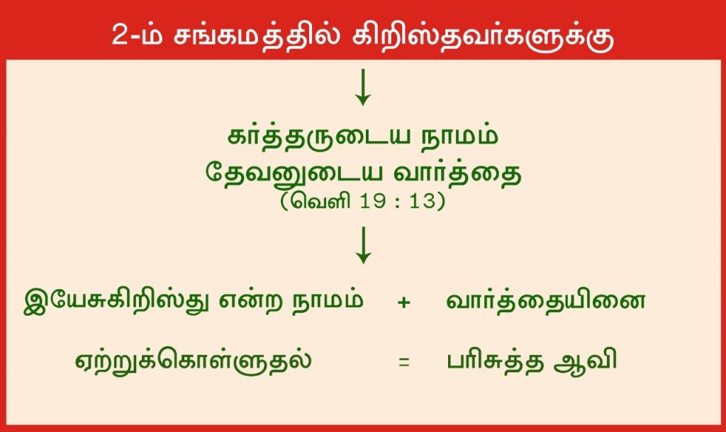 அதுபோல 2-ம் சங்கமத்திலும் வார்த்தைமீது விசுவாசம் வைத்து வார்த்தையினை ஏற்றுக்கொண்டால், பரிசுத்த ஆவியினைப் பெற்றுக்கொள்ளலாம். இப்போது பரிசுத்த ஆவியானது கர்த்தராகிய இயேசுகிறிஸ்து என்ற நாமத்தில் கட்டளையிடப்பட்டுள்ளது. சங்கம காலத்திற்கு முன்னர் 7 சபைக்காலங்களிலும் கொடுக்கப்பட்ட அடையாளம் ஞானஸ்நானமாகும்.
