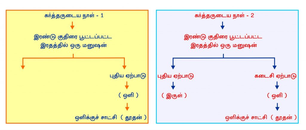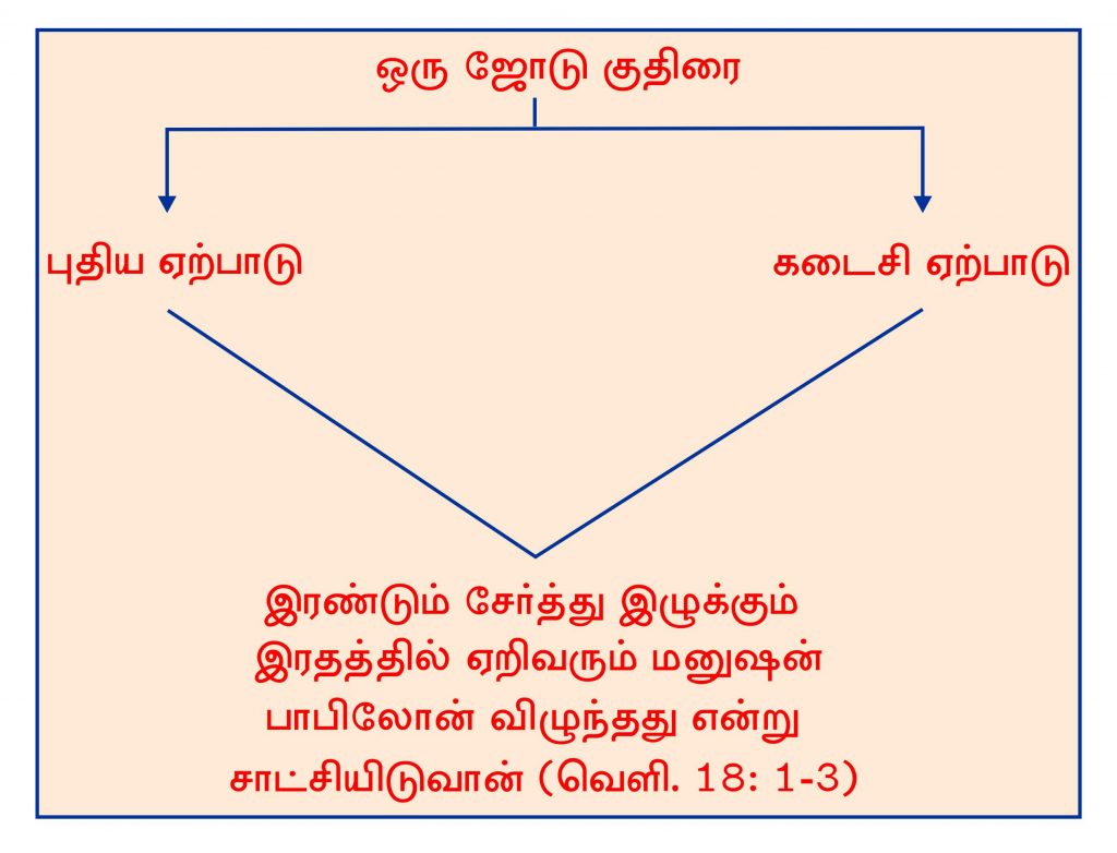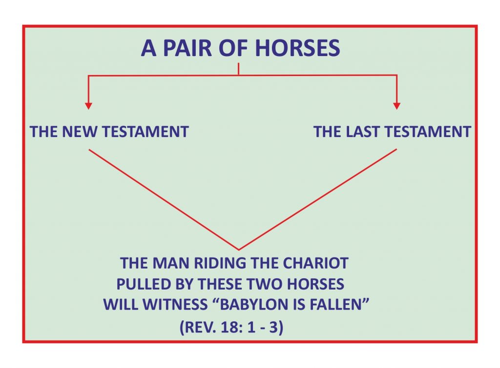கடைசி ஏற்பாட்டின் கர்த்தருடைய நாளிலும் ஒரு ஜோடு குதிரை பூண்ட இரதத்தின்மீது ஒரு மனுஷன் அமர்ந்து அந்த நாமத்தினைப் பறைசாற்ற வேண்டும். ஒரு தூதன் மூலம் இவைகள் அந்த மனிதனைக் கொண்டுஅறிவிக்கப்பட வேண்டும். ஒரு ஜோடு குதிரை பூண்ட இரதத்தின்மீது வருபவன் பாபிலோன் விழுந்தது, விழுந்தது என்று சத்தமிட வேண்டும். கடைசி ஏற்பாட்டில் அனுப்பப்படும் வார்த்தையினைக் குறித்து அவன் சாட்சியிட வேண்டும், தேவனின் நாமத்தினைக் குறித்து அவன் சாட்சியிட வேண்டும். அப்படி அவன் சாட்சியிடக்கூடிய வேளையில், ஒரு பலத்த ஜாதி எழும்பும். அது யோவேல் தீர்க்கதரிசியின் புத்தகத்தில் கூறப்பட்டபடி ஒளிக்குரியவர்களாகும். அந்தப் பலத்த ஜாதிக்கு வெளிச்சம் எது? இருள் எது? என்று தெரியும். இருள் பிசாசு; வெளிச்சம் கர்த்தர். கர்த்தரை அறிவதால் மட்டுமே பிசாசினை நாம் அடையாளம் காண முடியும். அந்த ஜாதி ஒளியைப் பற்றிக்கொண்ட ஜாதியாகும். அதுபோல பாபிலோனின் வேசித்தனம் அடையாளம் காட்டப்பட வேண்டும்; பிசாசினையும் பாபிலோனையும் அடையாளம் காட்டும் தேவனின் நாமம் அது தேவனின் நாமமாகிய வார்த்தையாகும்.