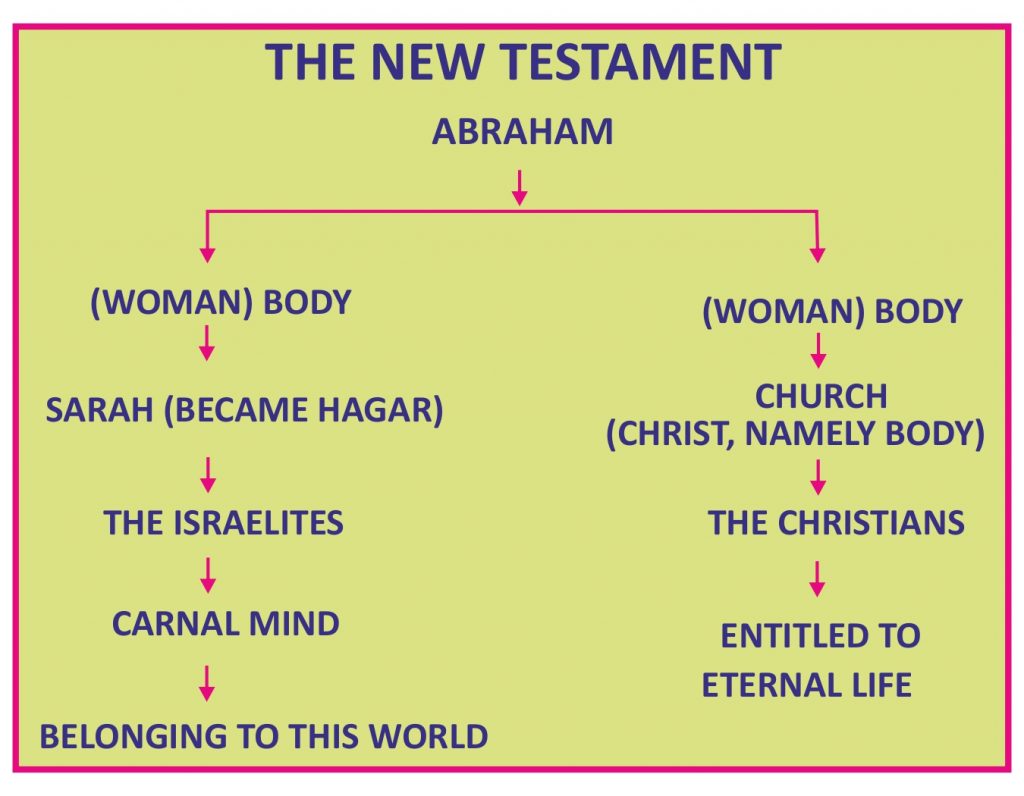 புதிய ஏற்பாட்டு காலம் ஆரம்பமானபோது, மாமிசத்தின்படி சாராளுடைய சந்ததியாராய் இருந்த இஸ்ரவேலர்கள் ஆவியின் சரீரத்திற்குள்ளாக ஆகாருடைய சந்ததியாக மாறினார்கள். எப்போதுமே ஸ்திரீயினை மையமாகக்கொண்டே இந்த நிகழ்வுகள் யாவும் நிகழ்த்தப்பட்டுள்ளது. புதிய ஏற்பாட்டுக் கால ஆரம்பத்தில் சபை என்ற அந்த ஸ்திரீக்குப் பெயர் சாராள். வாக்குத்தத்தம் பெற்ற சாராள் கிறிஸ்தவர்களுக்குத் தாயானாள். கிறிஸ்தவர்கள் யாவரும் சாராளின் சந்ததியானார்கள். ஜீவனுக்குரிய ஆசீர்வாதம் கிறிஸ்தவர்களிடமும், மாமிசத்திற்குரிய ஆசீர்வாதம் மாத்திரம் ஜீவனை இழந்துபோன ஆகாருடைய சந்ததியாக சாட்சியிடப்பட்டுள்ள இஸ்ரவேலருக்கும் கட்டளையிடப்பட்டது. இதுவே புதிய ஏற்பாடு. இந்த நிகழ்வுகள் புதிய ஏற்பாட்டுக் காலத்தின் நிறைவில் மாற்றியமைக்கப்படும். இப்படியாக ஒவ்வொரு காலத்திலும் சாராளின் தன்மையும், ஆகாரின் தன்மையும் காணப்பட்டது. அதேபோலொத்த நிலை புதிய ஏற்பாட்டின் நிறைவிலும் உருவாகும். இயேசுகிறிஸ்து மூலமாக கிருபையினைப் பெற்று கிறிஸ்தவர்களாக மாறியுள்ள புறஜாதிகளும் இருபிரிவாக பிரிக்கப்பட்டுள்ளார்கள். அது ஒன்று சாராளின் சந்ததி, மற்றொன்று ஆகாரின் சந்ததி. பாபிலோன் என்று சாட்சியிடப்பட்டுள்ள இந்த ஸ்திரீ கடைசி ஏற்பாட்டின் காலத்தில் அடிமைப்பெண்ணாகிய ஆகாரின் தன்மை கொண்டதாக சாட்சியிடப்படும்.