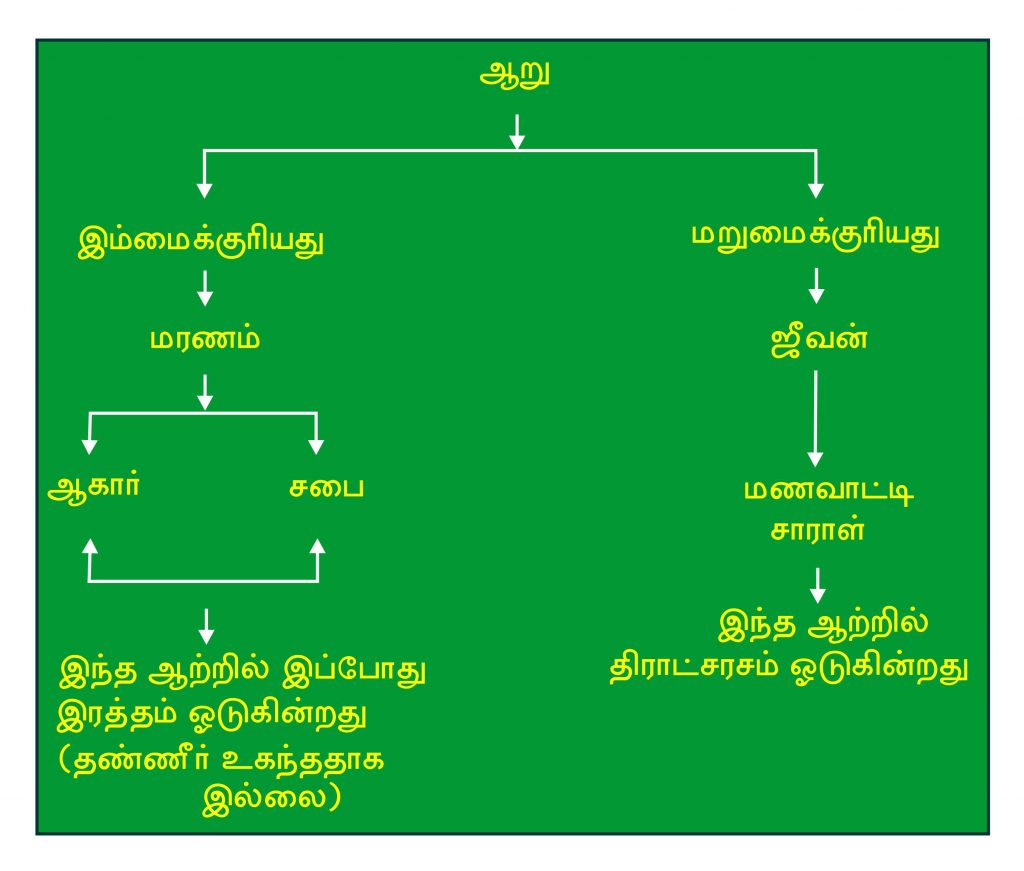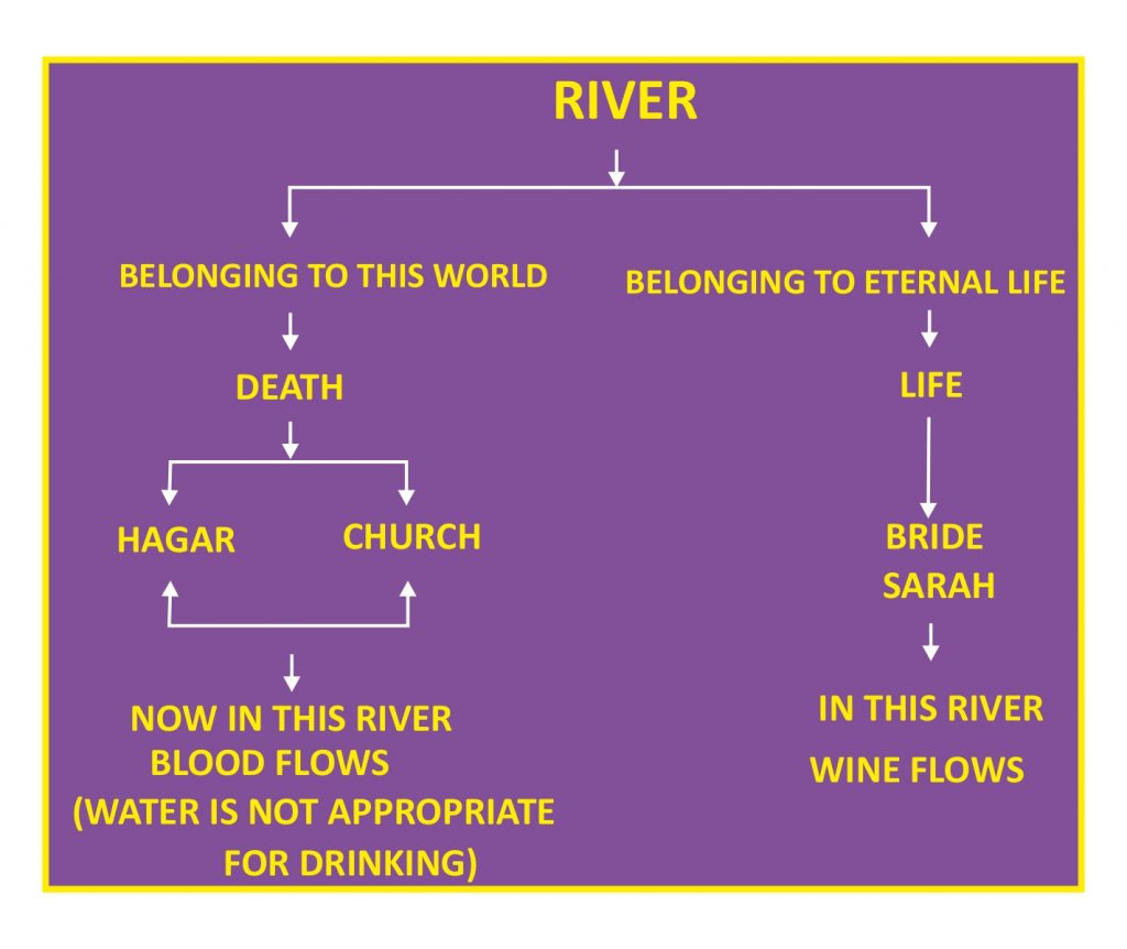 முதலில் பார்த்தோம், துரவில் எடுக்கப்பட்ட தண்ணீர் இரண்டு தன்மையில் இருந்தது. 1. இம்மைக்குரியது, 2. மறுமைக்குரியது. அதேபோலவே ஆறும் இருதன்மை கொண்டதாகப் பிரிக்கப்படுகின்றது. ஒன்று இம்மைக்குரியது. இன்னொன்று மறுமைக்குரியது. இந்த மறுமை என்பது ஜீவன்; இம்மை என்பது மரணம். இம்மைக்குரியவள் ஆகார் என்று பார்த்தோம். சாராள் ஜீவனுக்குரியவள்; ஜீவனைக் கொண்ட சுதந்திரவாளிகளைக் கொண்ட மணவாட்டி.
