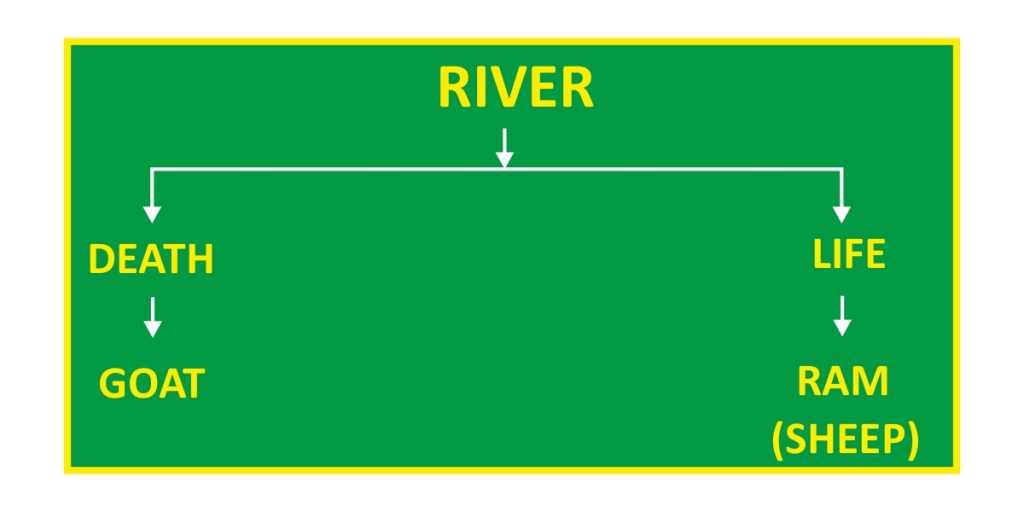 இந்த ஆறு இரண்டு பிரிவாக பிரிக்கப்படுகின்றது. அது இரண்டு தன்மையுள்ளதான தண்ணீரைக் கொடுக்கத்தக்க விதமாய் வேறுபிரிக்கப்படுகின்றது. ஒன்று ஜீவன், மற்றொன்று மரணம். இந்த ஆற்றிற்கு முன்பாக ஆட்டுக்கடா ஒன்று நிற்கின்றது. அதற்கு இரண்டு கொம்புகள் இருந்தது. இங்கே நின்றுகொண்டிருக்கும் செம்மறி ஆடு சாராள் என்றும், வெள்ளாடு ஆகார் என்றும் சாட்சியிடப்படுகின்றது.