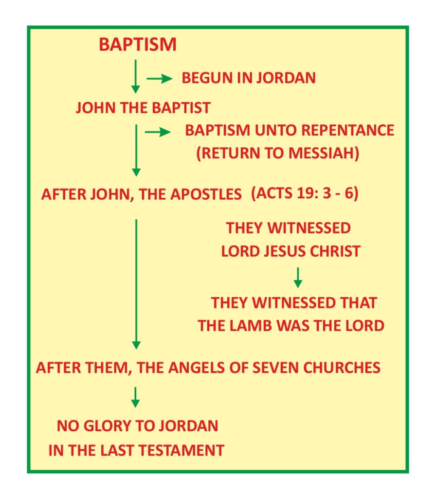 கிறிஸ்து நியாயப்பிரமாணத்தின் முடிவாய் இருந்தார். நியாயப்பிரமாணம் கிறிஸ்துவினால் நிறைவேறிற்று. யோர்தானின் மகிமை இஸ்ரவேலர்களுக்குள்ளாக அப்போது நிறைவடைந்திருந்தது. அதன்பின்னர் சபைக்காலங்கள், சபைப்பிரமாணங்கள் சாட்சியிடப்பட்டது. எனவே கிறிஸ்துவுக்குள் விருத்தசேதனம் இருந்தாலும் ஒன்றுமில்லை, விருத்தசேதனம் இல்லாவிட்டாலும் ஒன்றுமில்லை என்று பவுல் சாட்சியிட்டார்; புதுசிருஷ்டியாக மாறவேண்டும் என்பதே காரியம் என்று பவுல் சாட்சியிட்டார். அதே நிலைதான் கடைசி ஏற்பாட்டிலும் ஏற்படும். ஞானஸ்நானம் நிறைவேறிய அடையாளமாகும். அப்போது யோர்தானின் பெருமை அற்றுப்போய், அதற்கு பெருமை இல்லாதிருக்கும் நிலை சாட்சியிடப்படும். யோர்தானுக்கு மகிமையைக் கட்டளையிட்டவர் அதின் பெருமையினை அதனிடமிருந்து எடுத்துக்கொள்வார். அதற்குப் பெருமையினை கட்டளையிட்டவரே அதினிடத்தின்று அந்தப் பெருமையினை எடுத்துவிடுவார். அவருக்குரியவர்கள் யோர்தானின் பெருமைக்குள்ளாகமாட்டார்கள்.