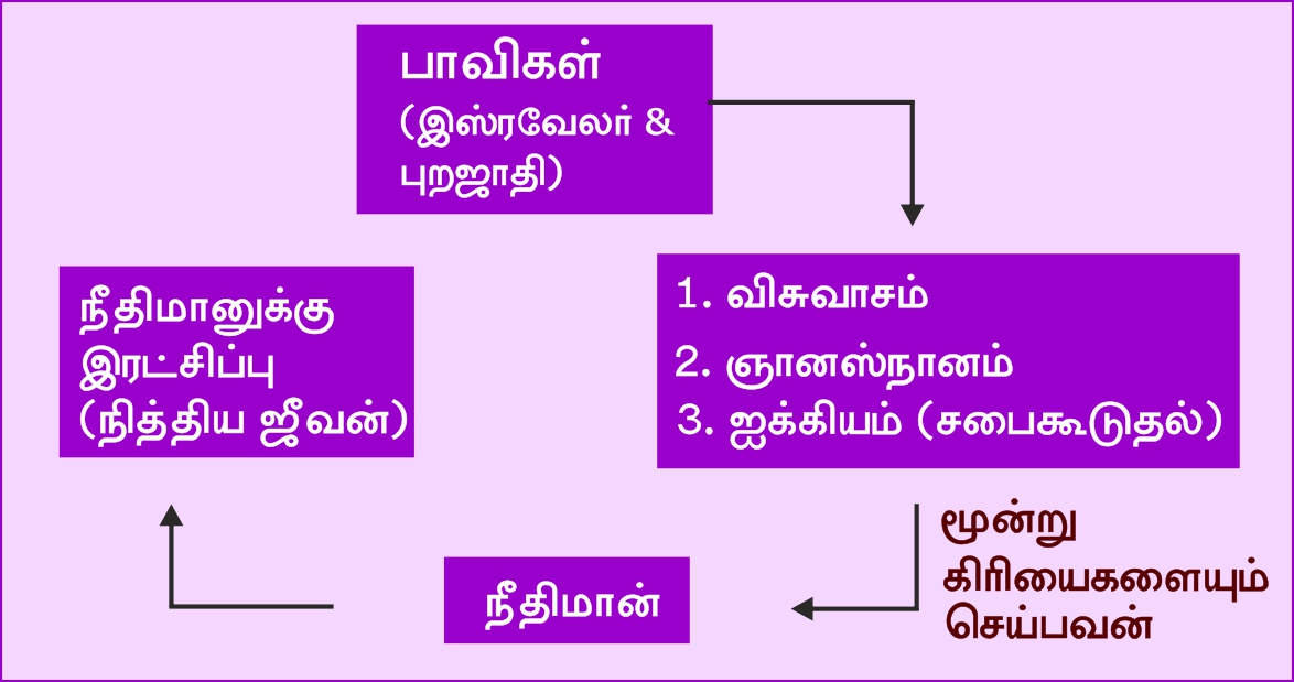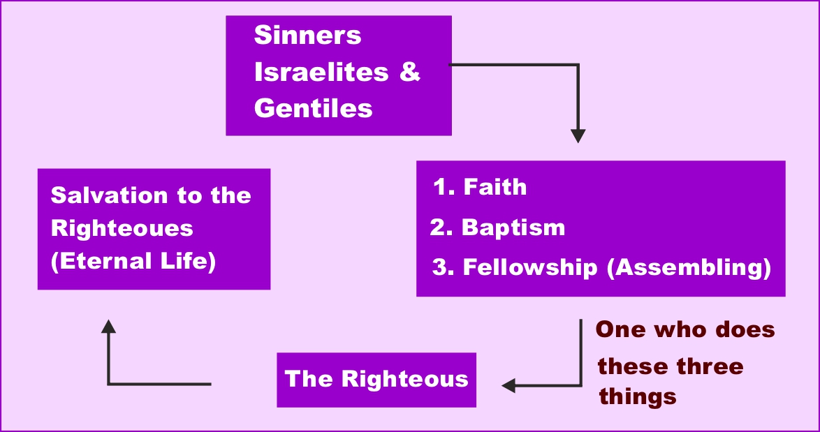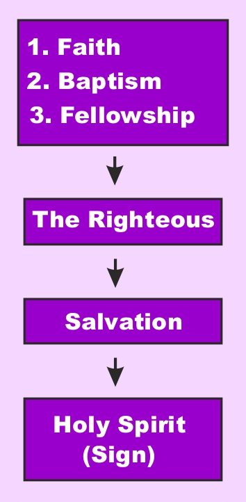 நீதிமான்களாக ஆக்கப்படுபவர்கள் இரட்சிப்பினை அடைவார்கள்; அந்த இரட்சிப்பினை அடைகின்றவர்களுக்குக் கொடுக்கப்படும் அடையாளம் பரிசுத்த ஆவி. விசுவாசம் இல்லாமல் பரிசுத்த ஆவியினைப் பெற்றுக்கொள்ள இயலாது. வேதம் எல்லோரையும் பாவிகள் என்று அறிக்கையிடுகின்றது. புறஜாதிகள் பாவிகள் என்று ஏற்கனவே பார்த்தோம். இயேசு கிறிஸ்து மாமிசத்தில் வெளிப்பட்டபோது இஸ்ரவேலரும் பாவிகள் ஆனார்கள். அவர்களுடைய பாவம் மன்னிக்கப்பட வேண்டுமானால், அவர்கள் இயேசுவைக் கர்த்தரென்று விசுவாசித்து அறிக்கையிடவேண்டும். அவர்தான் மேசியா என்று விசுவாசித்தால், அவர்களின் பாவம் நீங்கும். விசுவாசிக்காவிட்டால், அவர்கள் தங்கள் பாவங்களில் சாவார்கள். இதைத்தான் பவுல் கலாத்தியருக்கு எழுதின நிருபத்தில் கூறுகின்றார். பாவிகள் இரட்சிப்பினைப் பெறவேண்டுமானால், முதலாவதாக இயேசு கிறிஸ்துவின்மேல் விசுவாசம் வைக்க வேண்டும். இரண்டாவதாக, அன்றைக்கெனக் கட்டளையிடப்பட்ட அடையாளமான ஞானஸ்நானத்தினைப் பெற்றுக்கொள்ளவேண்டும்.