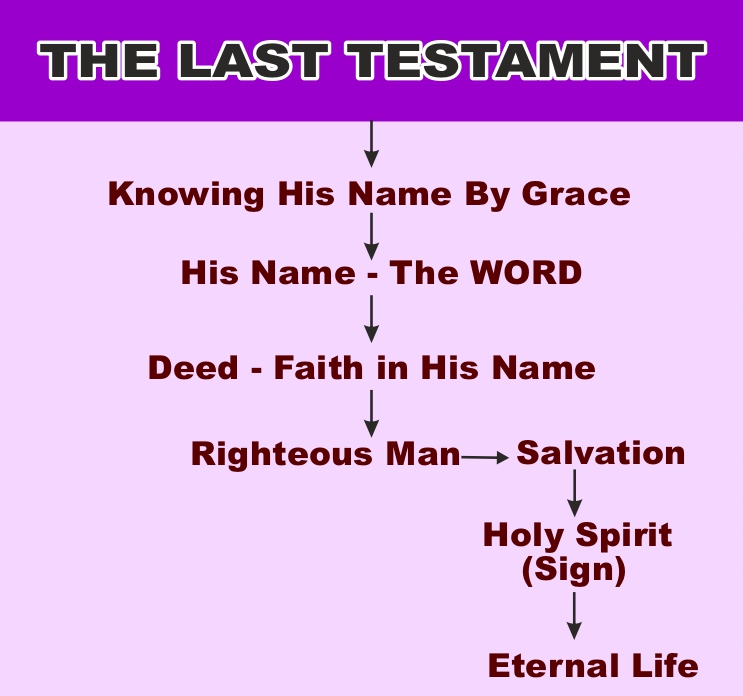 நீதிமானுக்கு இரட்சிப்பு; அதற்கு அடையாளம் பரிசுத்த ஆவி. இந்தக் கடைசி பிரமாணத்தில் பிந்தின ஆதாமாகிய இயேசு கிறிஸ்துவின் சந்ததியாகி உடன்படிக்கைக்குப் பாத்திரராகியுள்ள ஜனத்திற்கு அனுப்பப்பட்டுள்ள கர்த்தரின் நாமம் "வார்த்தை". இந்தக் கடைசிப் பிரமாணத்தினில், கர்த்தருடைய நாமம் "வார்த்தை". நாம் இயேசு கிறிஸ்து என்ற கிருபை இல்லாமல் ஆபிரகாமின் சந்ததிகளாக மாற முடியாது. நாம் இயேசுகிறிஸ்துவின் மூலமாகத்தான் ஆபிரகாமின் சந்ததிகளாக மாறியிருக்கின்றோம். இப்படியாக, ஆபிரகாமுடைய சந்ததிகளாக மாறியிருக்கின்ற ஜனத்தை இரண்டு பிரிவுகளாகக் கர்த்தர் பிரித்திருக்கின்றார். ஒன்று, அவருடைய நாமத்தில் விசுவாசம் உள்ள ஜனம். மற்றொன்று, அவரின் நாமத்தின்மேல் விசுவாசம் இல்லாத ஜனம். இந்த நாமம் அவர் அனுப்பி வைத்துள்ள பிரமாணம். இந்தப் பிரமாணத்தினை விசுவாசித்துக் கிரியைகளில் அவைகளை வெளிப்படுத்துபவர்கள் நீதிமான்கள். அவர்கள் பரிசுத்த ஆவியினைப் பெற்றுக்கொள்வார்கள்.