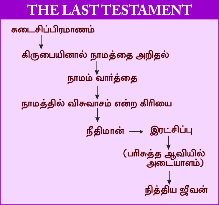இந்தக் கடைசி ஏற்பாட்டினிலும் கர்த்தர் ஒரு பிரமாணத்தினைக் கட்டளையிடுகின்றார். பழைய ஏற்பாட்டினில் கட்டளையிடப்பட்டது, நியாயப்பிரமாணம். புதிய ஏற்பாட்டினில் கட்டளையிடப்பட்டது, கிருபைப் பிரமாணம். இறுதியாகக் கொடுக்கப்பட்டுள்ளது, கடைசிப்பிரமாணம். இந்தக் கடைசிப் பிரமாணமும் கிருபையின் பிரமாணம்தான். நாமத்தின்மூலம் தான் கிருபை. அவருடைய நாமத்தின்மூலமாகக் கிருபை நமக்கு அனுப்பப்பட்டுள்ளது. அப்படியானால், இந்தக் கிருபையினைப் பெறவேண்டுமானால், நாமத்தினை விசுவாசிக்க வேண்டும். கிருபை அவருடைய நாமத்தின் மூலம் கட்டளையிடப்பட்டுள்ளது. நாம் இன்றைக்கெனக் கட்டளையிடப்பட்டுள்ள கர்த்தரின் நாமத்தினை விசுவாசிக்க வேண்டும்.