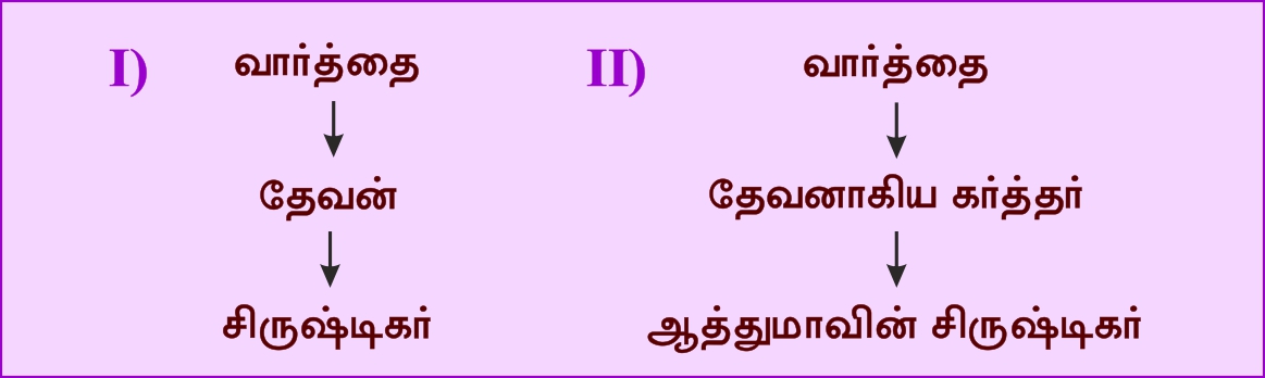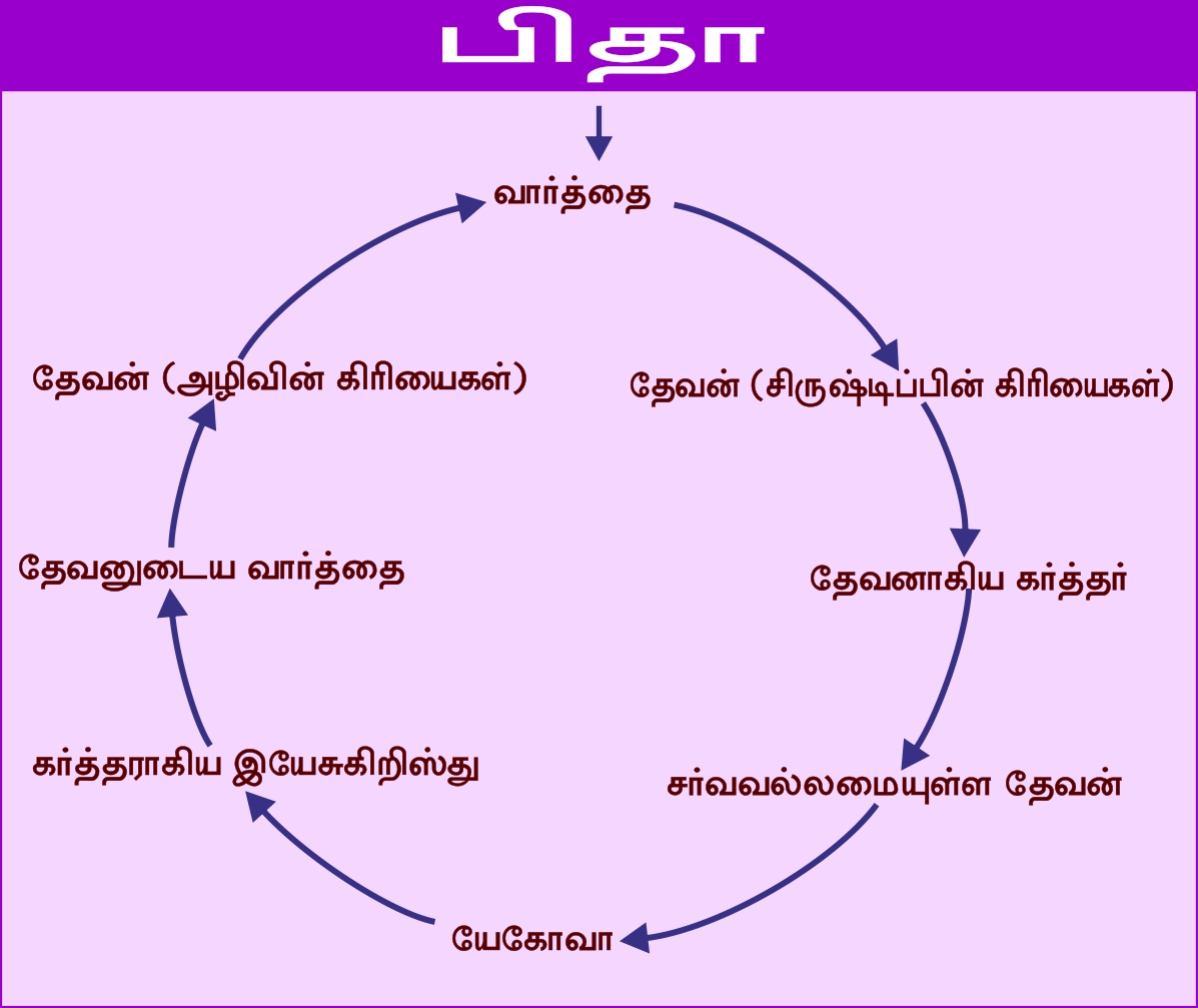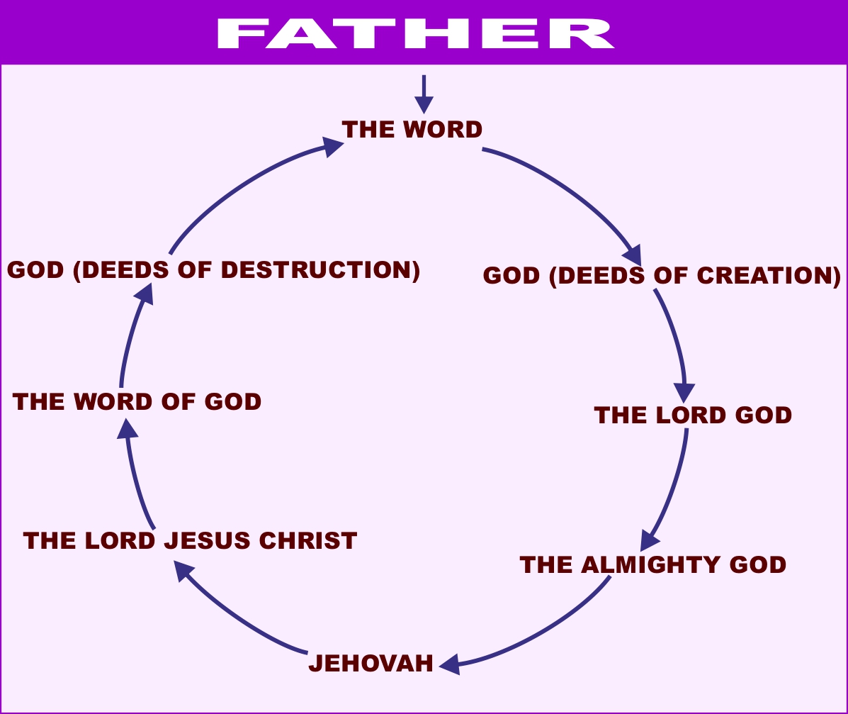 பிதாவிடமிருந்து அனுப்பப்பட்ட வார்த்தை, தேவன் என்ற நாமத்தில் கிரியையினை ஆரம்பித்து, வார்த்தை என்ற நாமத்தில் கிரியைகளை நிறைவேற்றி, பிதாவிடம் சென்றடைகின்றது.