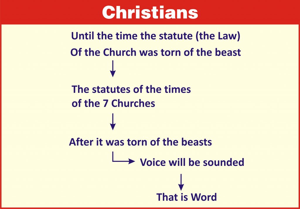 Just as the events that took place among the Israelites, it should happen among the Christians too. The Law of the Church must be fulfilled. It should come to a state of unworthiness of offering sacrifice. Until it becomes unworthy the baptism and the law of the Church will be the works of justice. Until the Law of the Church is fulfilled, the voice of the Word does not sound against the Babylon. After the completion of the Law of the Church, the voice of the Word must be sounded. That voice is the witness for the Eternal Life. When that voice begins to be sounded, the law of the Church will be fulfilled. After that, the sacrifices offered in the Churches, which work (act) with the laws of the seven churches, will not be accepted.