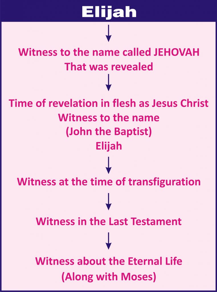 பழைய ஏற்பாட்டில் எலியா கொடுத்த சாட்சி யேகோவா என்னும் நாமத்தினைக் குறித்த சாட்சியாகும். கர்த்தர் தெய்வமானால், கர்த்தரைப் பின்பற்றுங்கள். நீங்கள் எந்தமட்டும் குந்திகுந்தி நடப்பீர்கள். யேகோவா தெய்வமானால், யேகோவாவைப் பின்பற்றுங்கள் என்று வெளிப்படுத்தப்பட்ட நாமத்திற்குச் சாட்சி கொடுத்தார். அடுத்தபடியாக, இயேசுகிறிஸ்து மாமிசத்தில் வெளிப்பட்டபோது, இயேசுகிறிஸ்து என்ற நாமத்திற்குச் சாட்சியிட்டார். யேகோவா என்ற நாமத்திற்குச் சாட்சியிட்டது மோசே. இயேசுகிறிஸ்து என்ற நாமத்திற்குச் சாட்சியிட்டது எலியா (யோவான்ஸ்நானனாக). இயேசுகிறிஸ்துவோடு மறுரூபமாகி இருவரும் சாட்சியிட்டுள்ளார்கள். மேலும் அவர்கள் இருவரும் கடைசி ஏற்பாட்டில் அவருடைய நாமத்தைக் குறித்துச் சாட்சியிடுவார்கள்.