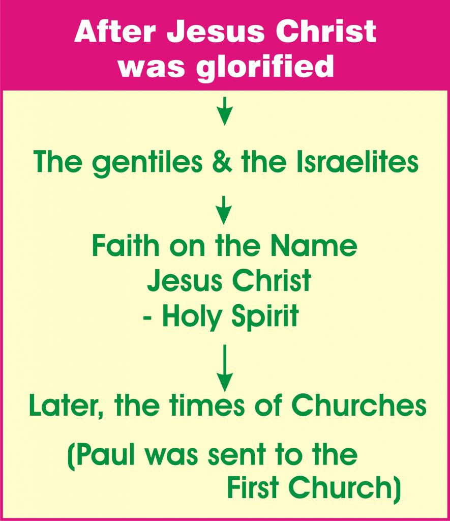 The name of Jesus Christ is the 'name of grace' commanded to the Gentiles. It is the name commanded to give the Holy Spirit. But, as long as Jesus Christ was glorified in flesh, the Holy Spirit was not sent in the name of Jesus Christ. Only after Jesus Christ attained glory, the Holy Spirit was commanded in the name of the Lord Jesus Christ. Since then, the name of Jesus Christ was commanded to the Father. Since then, the Holy Spirit was sent in the name of “JESUS CHRIST'. There are many offences seen in this today from since that day.