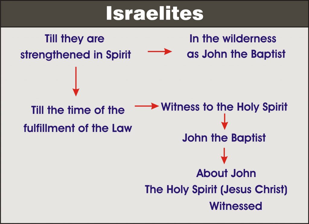 யேகோவா என்ற நாமத்தின் மூலமாகவும், நியாயப்பிரமாணத்தின் கிரியையின் மூலமாகவும் அனுப்பப்பட்ட பரிசுத்த ஆவி எப்போது நிறுத்தப்பட வேண்டும் என்று கர்த்தரால் திட்டம்பண்ணப்பட்டிருந்ததோ, அதுவரையிலும் அவன் வெட்டுக்கிளியையும், காட்டுத்தேனையும் சாப்பிட்டு வனாந்திரங்களில் சுற்றிக்கொண்டு இருந்தான். கிருபையின் மதகுகள் இஸ்ரவேலருக்கு எப்போது அடைக்கப்பட்டதோ, அப்போதே நியாயப்பிரமாணத்தின் கிரியைகள் என்ற பிரமாணம் நிறைவேறி, விசுவாசம் என்ற கிரியை வந்தது. கிறிஸ்துவை விசுவாசிக்க வேண்டும் என்பதற்காகவே யோவான்ஸ்நானன் சாட்சியிட அனுப்பப்பட்டான்.