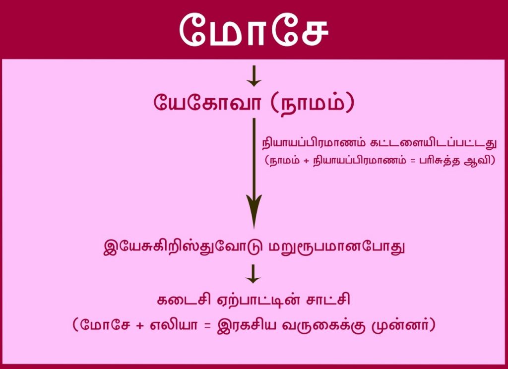 மோசே கர்த்தருடைய ஊழியக்காரன். அவன் தன்னைப் பின்பற்றி அநேகர் வருவார்கள்; அநேக அற்புதங்களும், அடையாளங்களும் தன்மூலம் நடக்கும் என்பதற்காக அந்தப் பதவியினை விடாமல் பிடித்துக்கொள்வதற்காக ஓடவில்லை. மோசே யேகோவாவிற்குச் சாட்சி. யேகோவா தன்னைக் குறித்து முட்செடியின் நடுவிலிருந்து சாட்சியிட்டார். மோசே யேகோவா என்ற கர்த்தரின் நாமத்திற்குச் சாட்சியிட்டார்; நியாயப்பிரமாணத்திற்குச் சாட்சியிட்டார். முதலில் யேகோவாவோடு வந்தார். பின்னர், இயேசுகிறிஸ்துவோடு மறுரூபமானபோது வந்தார். அதன்பின்னர், கடைசி ஏற்பாட்டில் வார்த்தைக்குச் சாட்சியாக வருவார்.