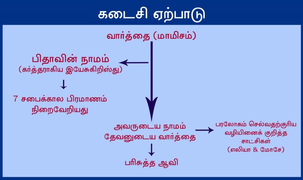 கடைசி ஏற்பாட்டின் இரண்டு சாட்சிகளும் வார்த்தைக்காக இரத்த சாட்சிகளாக மரிக்க வேண்டும். அவர்களோடு இருந்தவர்களும் சாட்சியினைப் பின்பற்றுவதினால், மாமிச மரணத்திற்குள்ளாக்கப்படுவார்கள். அந்த இரண்டு சாட்சிகளின் வார்த்தையினை ஏற்றுக்கொள்பவர்கள் இயேசுகிறிஸ்து என்னும் நாமத்தில் பரிசுத்த ஆவியினைப் பெற்றுக்கொள்வார்கள். அத்தோடு இயேசுகிறிஸ்து என்ற நாமத்தில் அனுப்பப்படும் பரிசுத்த ஆவியானவரின் கிரியைகள் இந்தப் பூமியில் நிறைவுபெறும்.