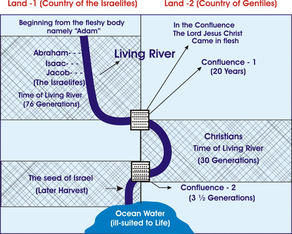 The Living River which overflowed with a rush and confluenced at one place. Before it entered into the nation of the Gentiles, it confluence at the junction where the nation of Israel and the nation of mingle and came with a whirl. The living river which flowed with a rush through the seeds of Israel must pass through the land of heathens namely the natural men. Before it passes through, it must join together at the confluence. After that, from the confluence it flows with a rush into the land of heathens that is the Christians. Later, from the seeds of heathens, namely the Christians it should again go back into the land of Israel. Then another confluence takes place there. This living river crosses the confluence and again it must turn back to the land of Israel.