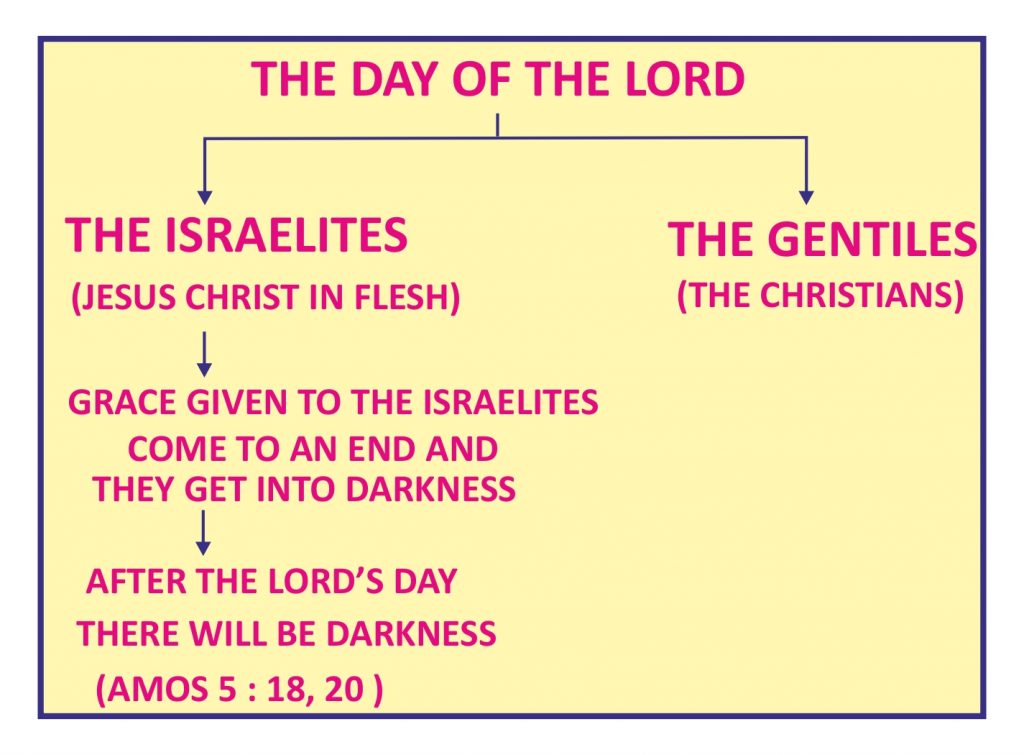 The Day of the Lord is divided into two categories. The first category is to the Israelites and the second one is to the Christians. At the first time, on the Day of the Lord, Lord Jesus Christ was revealed in flesh.