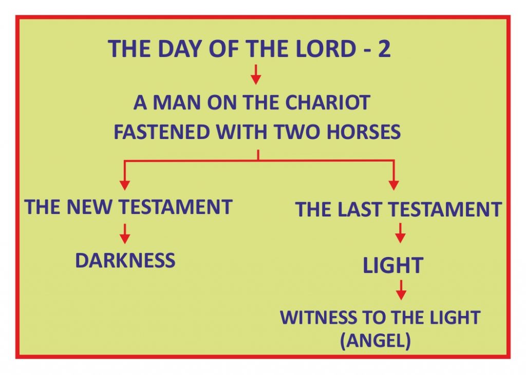 கடைசி ஏற்பாட்டின் கர்த்தருடைய நாளிலும் ஒரு ஜோடு குதிரை பூண்ட இரதத்தின்மீது ஒரு மனுஷன் அமர்ந்து அந்த நாமத்தினைப் பறைசாற்ற வேண்டும். ஒரு தூதன் மூலம் இவைகள் அந்த மனிதனைக் கொண்டுஅறிவிக்கப்பட வேண்டும். ஒரு ஜோடு குதிரை பூண்ட இரதத்தின்மீது வருபவன் பாபிலோன் விழுந்தது, விழுந்தது என்று சத்தமிட வேண்டும். கடைசி ஏற்பாட்டில் அனுப்பப்படும் வார்த்தையினைக் குறித்து அவன் சாட்சியிட வேண்டும், தேவனின் நாமத்தினைக் குறித்து அவன் சாட்சியிட வேண்டும். அப்படி அவன் சாட்சியிடக்கூடிய வேளையில், ஒரு பலத்த ஜாதி எழும்பும். அது யோவேல் தீர்க்கதரிசியின் புத்தகத்தில் கூறப்பட்டபடி ஒளிக்குரியவர்களாகும். அந்தப் பலத்த ஜாதிக்கு வெளிச்சம் எது? இருள் எது? என்று தெரியும். இருள் பிசாசு; வெளிச்சம் கர்த்தர். கர்த்தரை அறிவதால் மட்டுமே பிசாசினை நாம் அடையாளம் காண முடியும். அந்த ஜாதி ஒளியைப் பற்றிக்கொண்ட ஜாதியாகும். அதுபோல பாபிலோனின் வேசித்தனம் அடையாளம் காட்டப்பட வேண்டும்; பிசாசினையும் பாபிலோனையும் அடையாளம் காட்டும் தேவனின் நாமம் அது தேவனின் நாமமாகிய வார்த்தையாகும்.