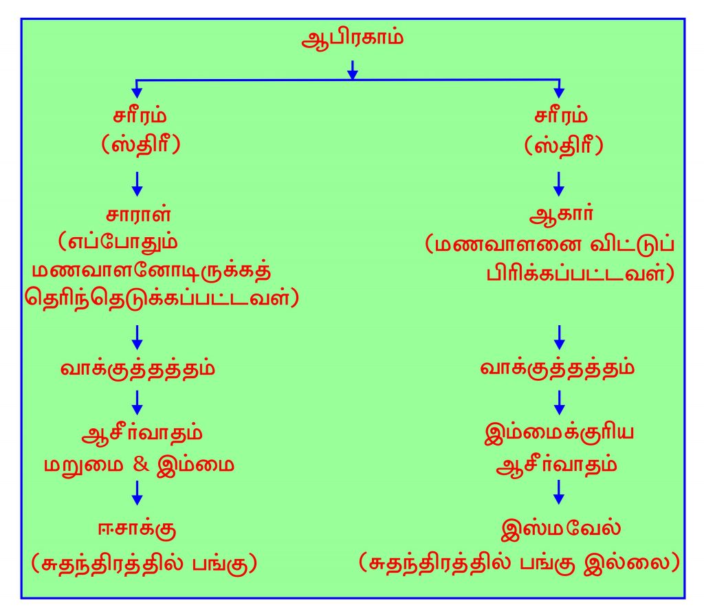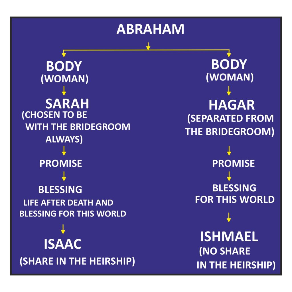 ஆபிரகாமிடமிருந்து இரண்டு பிரிவு ஜனங்கள் வருகின்றார்கள் அவர்கள் இரண்டு சரீரமாகிய ஸ்திரீகள் மூலம் பெருகுகின்றார்கள். ஒரு சரீரம் சாராள். இன்னொரு சரிரம் ஆகார். இரண்டு சரீரங்களுமே வாக்குத்தத்தம் பெற்றவர்களை பெற்றெடுத்தார்கள். ஒரு வாக்குத்தத்தம் இம்மைக்குரியது; மற்றொன்று இம்மையையும் மறுமையையும் தன்னகத்தே கொண்டது.