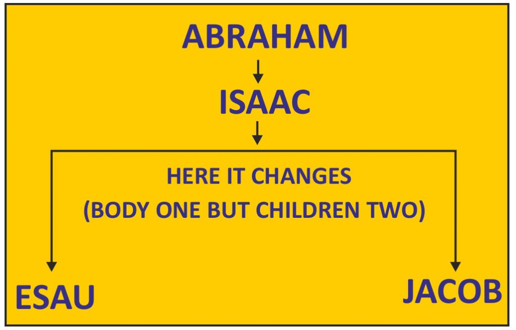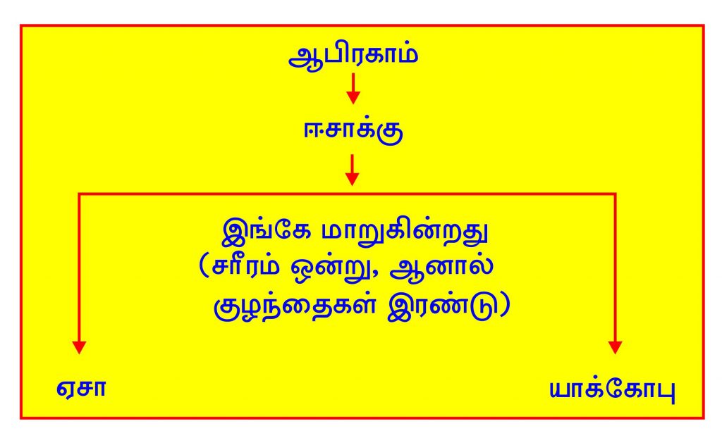 கொடுக்கப்பட்ட வாக்குத்தத்தத்தில் ஜீவனுக்குரிய காரியம் மட்டும் ஒரு பிரிவினருக்கு மட்டுமே கொடுக்கப்பட்டுள்ளது. ஜீவனுக்குரிய ஆசீர்வாதம் ஆபிரகாமிற்குக் கொடுக்கப்பட்டது. ஆபிரகாம் பெற்றுக்கொண்ட அந்த ஆசீர்வாதம் சாராள் மூலமாய் ஈசாக்கிற்குக் கொடுக்கப்பட்டது. ஈசாக்கு பெற்ற அந்த ஆசீர்வாதம் ரெபெக்காள் மூலம் யாக்கோபிற்கு வருகின்றது. யாக்கோபு அதனைப் பெற்றுக்கொண்டான். யாக்கோபிற்கு சகோதரனான ஏசா தன்னுடைய கிரியைகளில் உதாசீனம் பண்ணக்கூடிய ஒரு சூழல் வந்ததால், அதனை அவன் இழந்துபோனான். எனவே யாக்கோபின் சந்ததி மாத்திரம் அங்கே தெரிந்தெடுக்கப்பட்டது. யாக்கோபின் சந்ததியார் இஸ்ரவேலர்கள். இஸ்ரவேலர்களிலிருந்து யூதா கோத்திரம் பிரிக்கப்பட்டது. அதன்பின்னர் இயேசுகிறிஸ்து அனுப்பப்பட்டார். ஆகார், சாராள் என இரு பிரிவுகளாகப் பிரிக்கப்பட்டுள்ளதை அப்போஸ்தலனாகிய பவுலும் சாட்சியிட்டுள்ளார்.