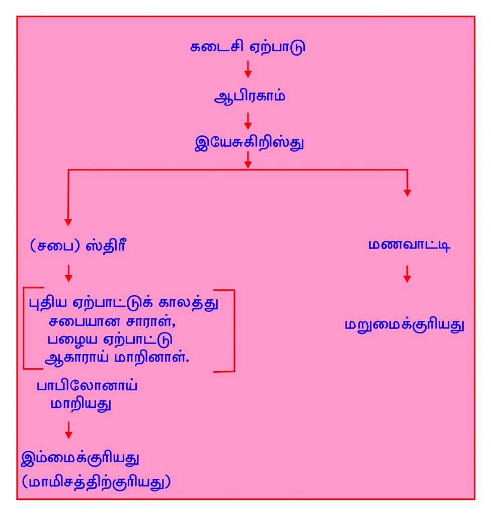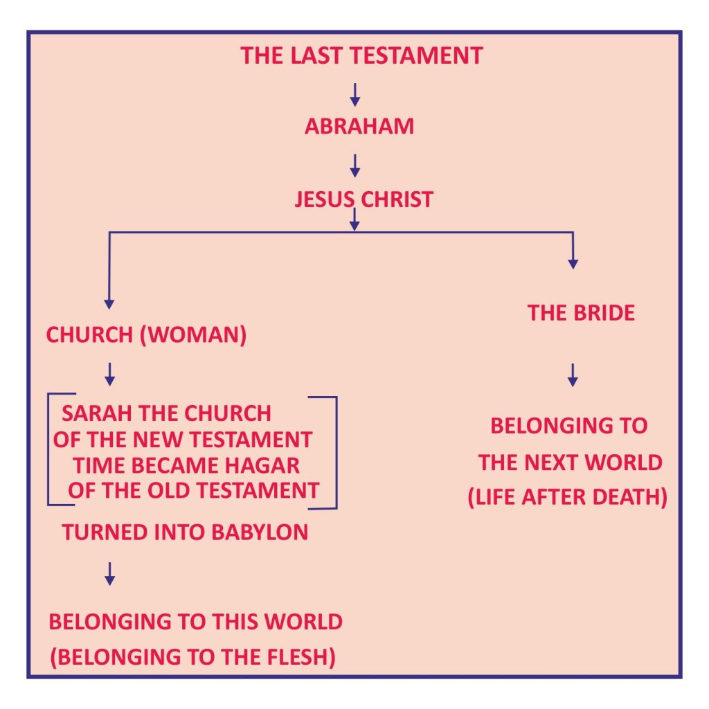 கடைசி ஏற்பாட்டில், சபைகள் மாமிசத்திற்குரியதாக மாறி ஆகாரின் சந்ததியாகின்றது. சபை என்ற ஸ்திரீ வெறும் மாமிசத்திற்குரியவளாக மாத்திரம் செயல்படுவாள். எனவே அவள் மணவாட்டிக்கு எதிர்த்து நிற்பாள்.