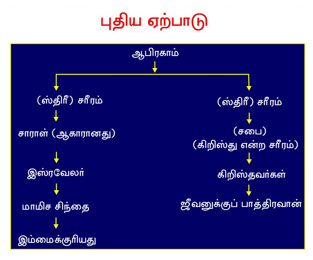 புதிய ஏற்பாட்டு காலம் ஆரம்பமானபோது, மாமிசத்தின்படி சாராளுடைய சந்ததியாராய் இருந்த இஸ்ரவேலர்கள் ஆவியின் சரீரத்திற்குள்ளாக ஆகாருடைய சந்ததியாக மாறினார்கள். எப்போதுமே ஸ்திரீயினை மையமாகக்கொண்டே இந்த நிகழ்வுகள் யாவும் நிகழ்த்தப்பட்டுள்ளது. புதிய ஏற்பாட்டுக் கால ஆரம்பத்தில் சபை என்ற அந்த ஸ்திரீக்குப் பெயர் சாராள். வாக்குத்தத்தம் பெற்ற சாராள் கிறிஸ்தவர்களுக்குத் தாயானாள். கிறிஸ்தவர்கள் யாவரும் சாராளின் சந்ததியானார்கள். ஜீவனுக்குரிய ஆசீர்வாதம் கிறிஸ்தவர்களிடமும், மாமிசத்திற்குரிய ஆசீர்வாதம் மாத்திரம் ஜீவனை இழந்துபோன ஆகாருடைய சந்ததியாக சாட்சியிடப்பட்டுள்ள இஸ்ரவேலருக்கும் கட்டளையிடப்பட்டது. இதுவே புதிய ஏற்பாடு. இந்த நிகழ்வுகள் புதிய ஏற்பாட்டுக் காலத்தின் நிறைவில் மாற்றியமைக்கப்படும். இப்படியாக ஒவ்வொரு காலத்திலும் சாராளின் தன்மையும், ஆகாரின் தன்மையும் காணப்பட்டது. அதேபோலொத்த நிலை புதிய ஏற்பாட்டின் நிறைவிலும் உருவாகும். இயேசுகிறிஸ்து மூலமாக கிருபையினைப் பெற்று கிறிஸ்தவர்களாக மாறியுள்ள புறஜாதிகளும் இருபிரிவாக பிரிக்கப்பட்டுள்ளார்கள். அது ஒன்று சாராளின் சந்ததி, மற்றொன்று ஆகாரின் சந்ததி. பாபிலோன் என்று சாட்சியிடப்பட்டுள்ள இந்த ஸ்திரீ கடைசி ஏற்பாட்டின் காலத்தில் அடிமைப்பெண்ணாகிய ஆகாரின் தன்மை கொண்டதாக சாட்சியிடப்படும்.