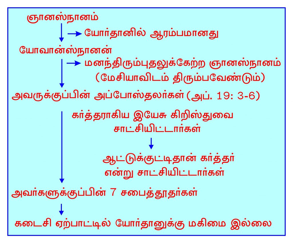ஞானஸ்நானம் யோவான்ஸ்நானன் மூலம் ஆரம்பமானது. யோவான்ஸ்நானன், "மனந்திரும்புதலுக்கு ஏற்ற ஞானஸ்நானத்தினைக்" கொடுத்தார். அதன்படி யோவான்ஸ்நானனுக்குப் பின் வருபவரை அவர்கள் விசுவாசிக்க வேண்டும். அவர்களது மனம் இயேசுகிறிஸ்துவிடம் திரும்பவேண்டும். யோவான்ஸ்நானன் வந்து சாட்சி கொடுத்த பின்னர், அடுத்த சாட்சி இயேசுகிறிஸ்து மூலம் எழும்பியது; யோவான்ஸ்நானன் புறஜாதிகளை சீஷர்களாக மாற்றவில்லை; இஸ்ரவேலர்களை சீஷர்களாக்கினார். இஸ்ரவேலர்கள் உலகத்தின் பாவத்தினைச் சுமந்து தீர்க்க வந்த தேவ ஆட்டுக்குட்டியாகிய கிறிஸ்துவை விசுவாசிக்க வேண்டும் என்பதே யோவான்ஸ்நானன் கொடுத்த சாட்சி. இயேசுகிறிஸ்து மகிமைப்பட்ட பின்னர், பரிசுத்த ஆவி கர்த்தராகிய இயேசுகிறிஸ்து என்னும் நாமத்தில் கட்டளையிடப்பட்டது. அப்போதுமுதற்கொண்டு கர்த்தராகிய இயேசுகிறிஸ்துவின் நாமத்தில் சீஷர்கள் ஞானஸ்நானம் கொடுத்தார்கள். எனவேதான் அப்போஸ்தலனாகிய பவுல்: நீங்கள் எந்த ஞானஸ்நானம் பெற்றீர்கள் என்று கேட்டார். அவர்கள் நாங்கள் யோவான்ஸ்நானன் கொடுத்த ஞானஸ்நானம் பெற்றோம் என்றபோது, அது உங்களுக்குப் போதாது; அதற்குரிய காலம் நிறைவடைந்துவிட்டது. இப்போது நீங்கள் கர்த்தரது நாமம் இயேசுகிறிஸ்து என்று விசுவாசித்து, அந்த நாமத்தில் ஞானஸ்நானம் பெறவேண்டும். எனவேதான் கர்த்தராகிய இயேசுகிறிஸ்துவின் நாமத்தில் பவுல் ஞானஸ்நானம் கொடுத்தார். மேலும் அந்த சுவிசேஷ வார்த்தைக்குச் சாட்சியிடும் கூடுகையோடும் நீங்கள் ஐக்கியப்பட வேண்டும் என்பதே அப்போது சுவிசேஷமாக சாட்சியிடப்பட்டது. அப்படி ஐக்கியப்பட்டவர்கள் பரிசுத்த ஆவியினைப் பெற்றுக்கொண்டார்கள்.