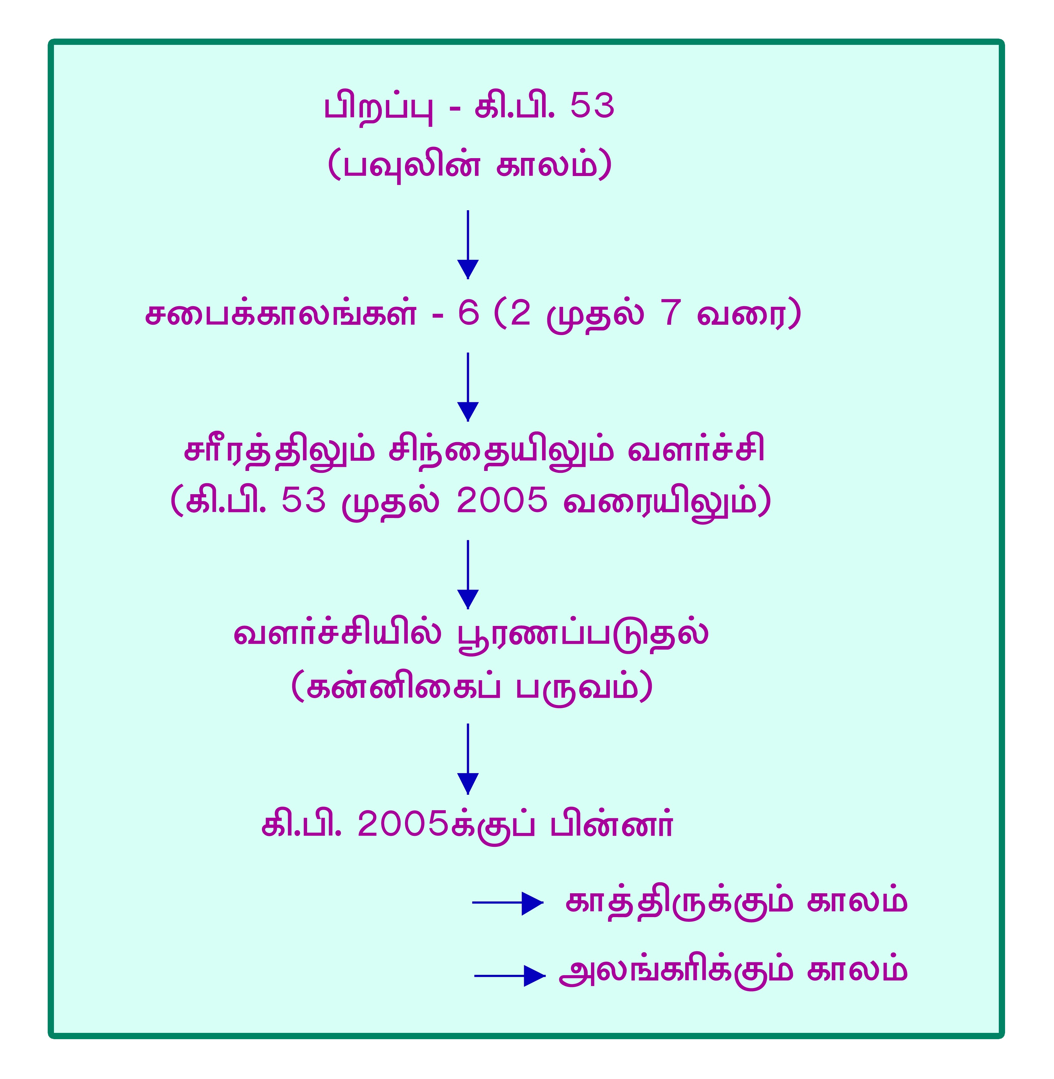 கன்னிகையின் வளர்ச்சியினை நான்கு பகுதிகளாக பிரித்துப் பார்க்கின்றோம். நாம் ஜீவிக்கும் இந்தக் காலமானது, ஆவியின் சரீரமானது வளர்ச்சியில் பூரணப்படும் காலம். ஆவியின் வளர்ச்சியில் பூரணம் என்பது வெளிப்படுத்தப்படும் ஆவிக்குரிய இரகசியங்கள் அனைத்தையும் அறிந்துகொள்ளும் காலமாகும். உலகத்தோற்ற முதல் மறைபொருளாய்க் கூறப்பட்டுள்ள இரகசியங்களைக் கர்த்தர் தமது ஆவியின் மூலம் வெளிப்படுத்தும் காலமாகும். கன்னிகை தனது வளர்ச்சியில் பூரணப்பட்டு மணவாட்டியாய் எடுத்துக்கொள்ளப்படுவதற்கென்று ஒரு காலம் முன்குறிக்கப்பட்டுள்ளது. அது அவள் மணவாளனைக் குறித்தும் தன்னிலை குறித்தும் அறியக்கூடிய அறிவில் பூரணப்படும் காலமாகும்.